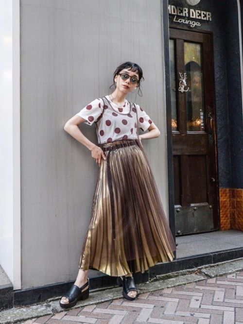 透け感のあるロング丈のプリーツスカートは、キャメルカラーでレトロなデザイン。レザーや黒系のアイテム、サングラスなどと合わせると、クラシカルなモード系ファッションが完成!