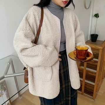 ベーシックカラーのベージュボアジャケットは、色々なアイテムに合わせやすいので、1着は持っておきたいですね。