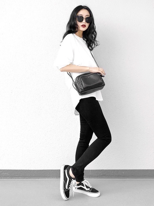 Tシャツ×スニーカーのカジュアルコーデだって黒スキニーならすっきりシンプルにおしゃれに決まります♪