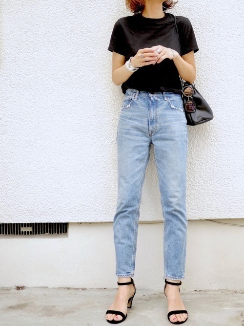 シンプルな黒Tシャツとデニムスキニーパンツって憧れるけど、スタイル良くないとキマらないんじゃない?なんて思っているアナタにすすめたいのが、華奢なサンダルや派手色パンプス。