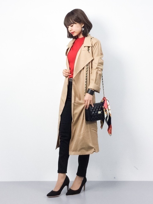 こちらはマウジースキニーパンツにトレンチコートを合わせた、上品レディなコーデ。