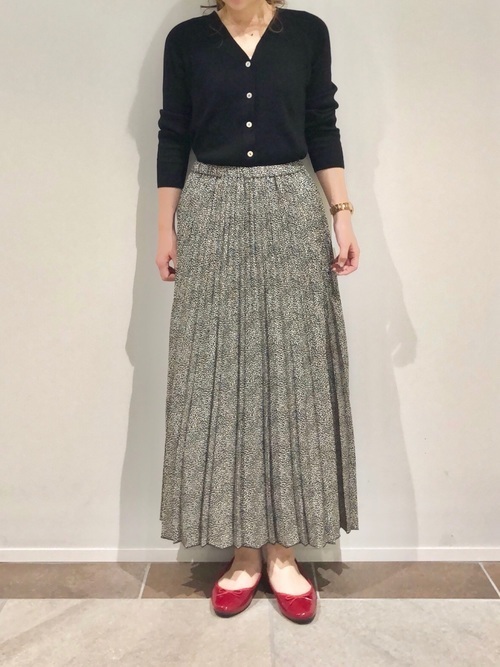 ドレッシーなロングプリーツスカートにも、ネイビーカーディガンを合わせるのが◎。シックなネイビーカーディガンをプラスすることで、品よく映えるレディースコーデを着こなせますよ。