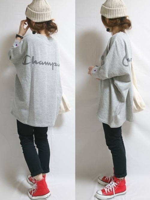 赤のコンバースはコーデの差し色になってくれていますね!トップスにはオーバースウェットを組み合わせて、ビッグシルエットの可愛さを叶えます。