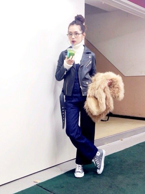 オールインワンと合わせてもかわいいライダースジャケット。ショート丈のものが多いライダースジャケットはどんなボトムスとも相性抜群なのがうれしいポイント♪アップヘアでもタートルネックのインナーなら首元まであったか冬コーデにできちゃうのでおすすめ♡上がスッキリしてるのでワイドめのボトムスとの相性もいいですよ♪