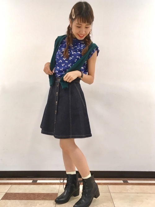 夏らしい青のファッションにレースアップブーツを合わせたコーデのこちら。
