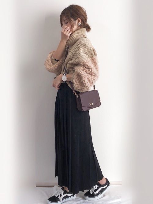 おしゃれなカフェ女子会ではスカートを選ぶのが◎。今回の女子会コーデのポイントはとにかくかわいい冬コーデになっていることです。ボリュームニットは袖の部分がファーになっていてとってもかわいらしく、女子会コーデにピッタリのニットです。