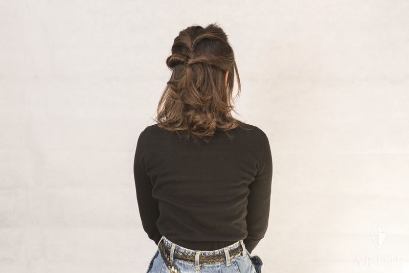 3. ハーフアップを髪の中央で分け、逆くるりんぱする