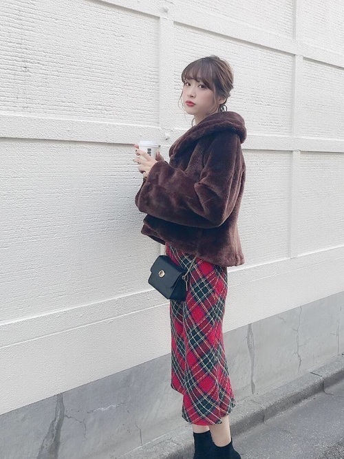 コーデのアクセントにもなりそうなボリューミーなアウターにチェックタイトスカートを合わせたコーデ♡ブラウンのアウターとチェックタイトスカートの絶妙な色合いに思わずキュンとしますね♡全体のシルエットのなかでメリハリが感じられるコーデになっています。