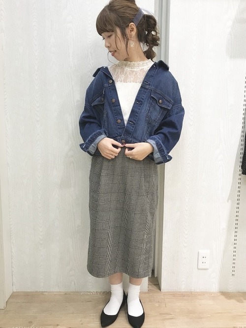 春の印象を受けるデニムジャケットにチェックタイトスカートを合わせたもの。トップスからチェックタイトスカートまで落ち着いた色味で合わせるなら、バッグやシューズなどの小物でパキッとした色味のアイテムを取り入れるのがおすすめです♪