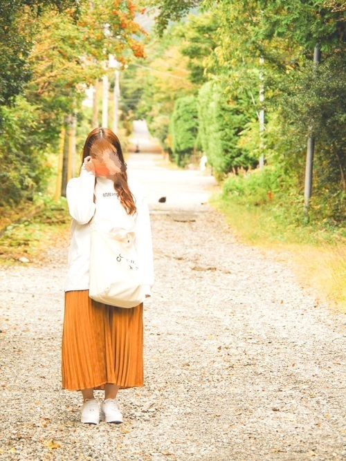 こちらはプリーツ×オレンジスカートのアイテムコーデ。プリーツスカートの魅力は、ふんわりしたシルエットが上品見せを叶えてくれるところ。
