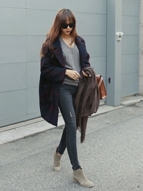 フィットする細身のデニムでカジュアル感を出しつつも、きれいめのシルエットのコートや、ヒールのあるブーツを選ぶことでモードっぽい仕上がりになっています!
