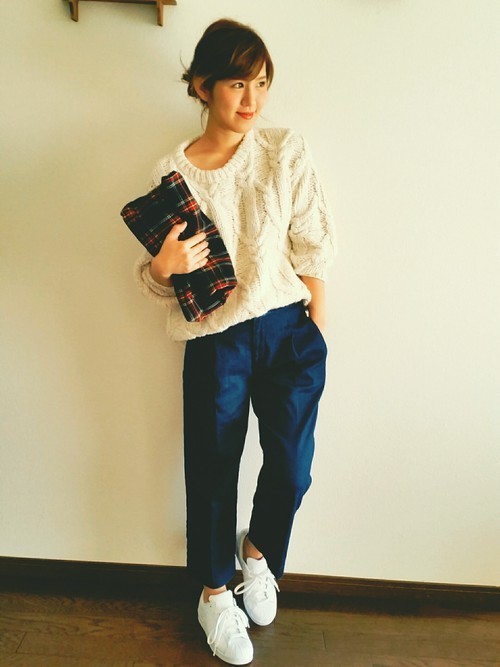 ボトムスはピタッとシルエットの出るようなデザインのものを選んで女性らしく。しかし、足元はスニーカーをチョイスしてカジュアル感を演出して♡いつもはヒールを選ぶところでもスニーカーを選ぶことでヌケ感が加わり、アメカジさアップです♪