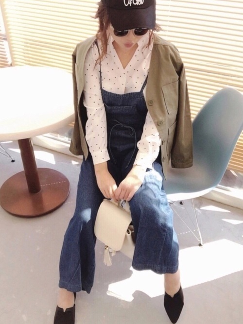 カーキに合うデニムのオーバーオールと白地のシャツのカジュアルコーデ!シャツは、大流行中のドット柄で今年の顔ともいえるコーデにしてみて下さい。ドット柄はメルヘンな印象を持っている方も多いですが、カジュアルでボーイッシュなコーデに合わせたり、レトロに着こなすのもかわいいんです!