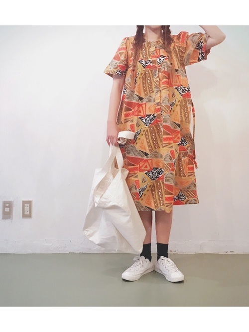 こちらの幾何学のような総柄のワンピースは、1点だけでこなれ感のあふれるコーデができますね!以前までは古着で多く見かけた幾何学柄ですが、最近では新品の商品を取り扱うお店でも見かけるようになりました♡