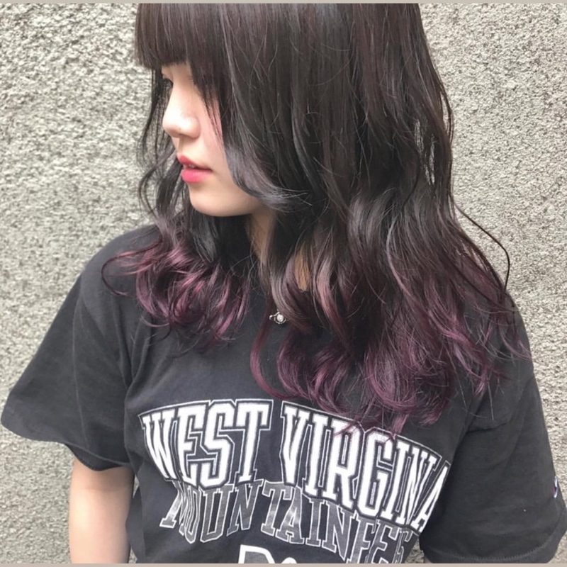 パープルのヘアカラーは透け感をプラスしてくれるので、黒髪と合わせて女心をくすぐるヘアスタイルに♡
