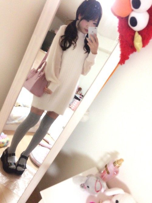 全体をとろけるような甘いミルキーカラーに統一したモテコーデ。ホワイトのロングニットワンピは男の子が着てほしい定番ファッション。ニーハイソックスを掛け合わせれば、誰もがついドキッとしてしまうかわいさに♡